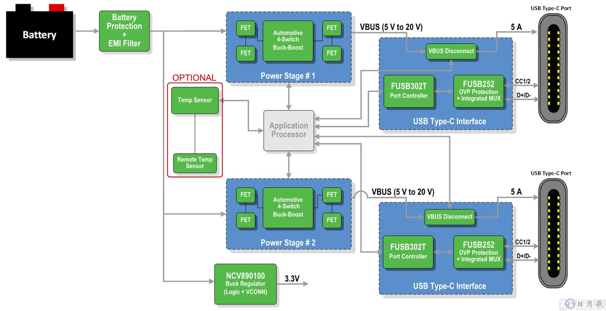 安森美半導(dǎo)體的FUSB302B是完全符合AEC-Q100車(chē)規(guī)的可編程的USB Type-C控制器,含電源傳輸,集成了一個(gè)BMC客戶端配置通道,支持全Type-C PD 2.0 的1.1版本。這意味著CC可用于檢測(cè)設(shè)備何時(shí)連接或未連接、主機(jī)或設(shè)備的當(dāng)前功能,以及是否存在有源電纜,以及選擇所需的模式(如音頻適配器或調(diào)試附件模式)。圖1顯示了一個(gè)典型應(yīng)用的框圖。