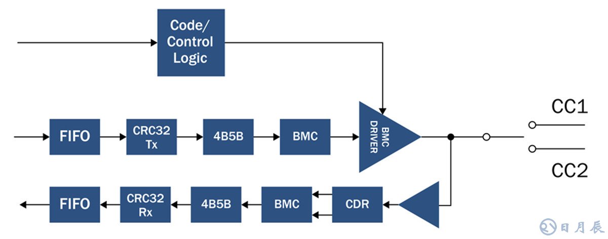 Type-C連接可正反逆插,為用戶帶來(lái)了更多的便利,卻使開(kāi)發(fā)更復(fù)雜。方向通過(guò)新的配置通道(CC)管理,該配置通道在連接器上有兩個(gè)專(zhuān)用的引腳,并支持連接的設(shè)備協(xié)商需要提供或汲取多少電源。該通道使用的協(xié)議是一種稱(chēng)為雙相符號(hào)編碼(BMC)的差分曼徹斯特編碼。USB Implementer Forum(USB-IF)定義了五個(gè)供電配置文件:10W、18W、36W、60W和100 W。使用BMC協(xié)議,電源配置文件可在含USB Type-C接口的兩臺(tái)設(shè)備之間進(jìn)行交換。編碼方案使用轉(zhuǎn)換來(lái)表示邏輯電平,而不是絕對(duì)電平,并且它結(jié)合了自己的時(shí)鐘信號(hào),使得同步更簡(jiǎn)單。然而,BMC協(xié)議依賴于一個(gè)物理接口,該接口能在具電氣挑戰(zhàn)的環(huán)境中可靠地解碼信號(hào),而且很少有電氣環(huán)境比車(chē)輛環(huán)境更具挑戰(zhàn)性。