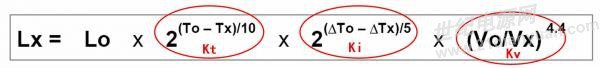 電解的實際使用壽命的計算,可用下面的公式表示: Lx=Lo·Kt·Ki·Kv