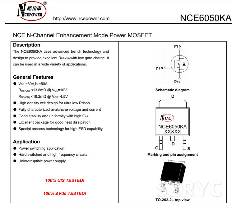 NCE6050KA場(chǎng)效應(yīng)管 TO-252封裝, 12MR內(nèi)阻 50A 60V,可以用RY50N06 TO-252的代替,單價(jià)只要一半