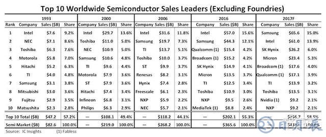 ▲ICInsights機(jī)構(gòu)發(fā)布的1993-2017F全球半導(dǎo)體十大廠商變遷圖
