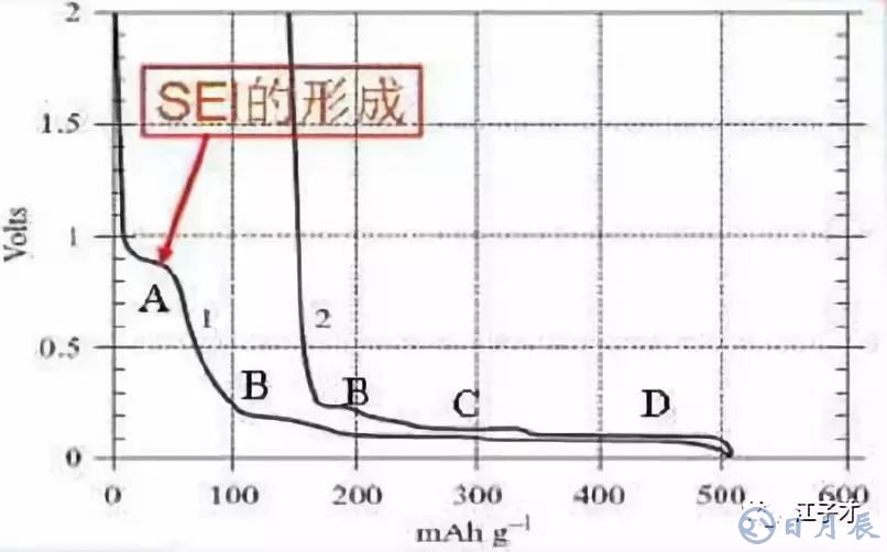 石墨理論容量372mAh/g,當(dāng)然只有石墨化度非常高的材料才可以達(dá)到這個(gè)值。但是所有碳素材料在經(jīng)過首次充放電時(shí)都會存在由于副反應(yīng)帶來的不可逆容量損失。隨著負(fù)極電位的降低,直到電解液中成分在負(fù)極表面形成一種穩(wěn)定的鈍化膜(SEI)而停止。首次放電出現(xiàn)四個(gè)電壓平臺(如下圖),其中A為SEI的形成,石墨大部分容量在0.3~0.005V范圍內(nèi)。除A之外,不同的電壓平臺對應(yīng)著不同的嵌鋰狀態(tài),分別稱之為四階、三階化合物…最后形成LiC6,達(dá)到理論容量372mAh/g,晶面間距變?yōu)?.37。(來源于書本期刊)