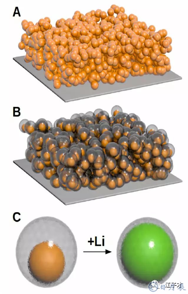 硅/碳復(fù)合材料,主要是碳包覆,如下圖,雖然預(yù)留了膨脹空間,改善了循環(huán)性能,但是壓實(shí)密度小,且工業(yè)化難度大。