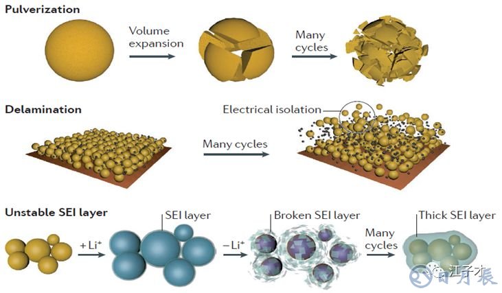 在充放電過程中,硅的脫嵌鋰反應(yīng)將伴隨大的體積變化(>300%),造成材料結(jié)構(gòu)的破壞和機(jī)械粉化,導(dǎo)致電極材料間及電極材料與集流體的分離,進(jìn)而失去電接觸,致使容量迅速衰減,循環(huán)性能惡化。由于劇烈的體積效應(yīng),硅表面的SEI膜處于破壞-重構(gòu)的動(dòng)態(tài)過程中,會造成持續(xù)的鋰離子消耗,進(jìn)一步影響循環(huán)性能。