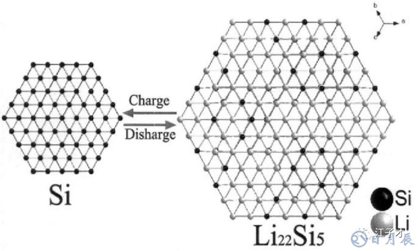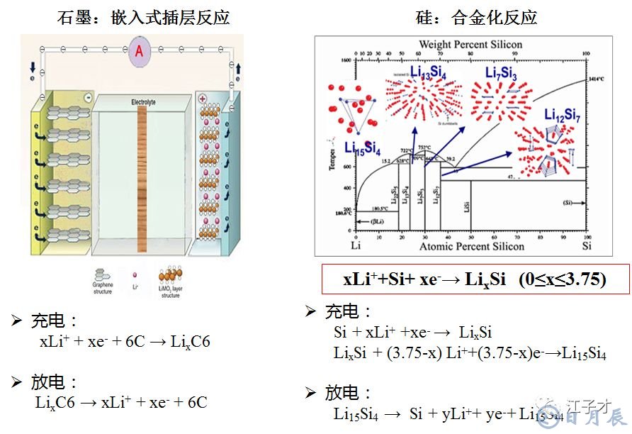 硅的充放電機(jī)理和石墨的充放電機(jī)理有所不同,石墨是鋰的嵌入和脫嵌,硅則是合金化反應(yīng)。