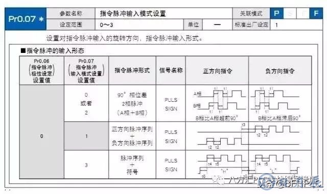 Pr0.07:伺服控制脈沖輸入方式。PLC發(fā)送高速脈沖給伺服驅(qū)動(dòng)器,有幾種方式,可以是正轉(zhuǎn)一路脈沖,反轉(zhuǎn)一路脈沖;也可以是只用一路脈沖,而增加一個(gè)方向控制信號(hào)(高低電平即可),當(dāng)然也可以是90°相位差的2相脈沖,Pr0.07分別設(shè)置為“1”、“3”、“0”或“2”。可以看出除了設(shè)置為“3”只需一路脈沖就可實(shí)現(xiàn)定位控制,其他三者都需要兩路脈沖,對(duì)于一個(gè)軸控制(即一套伺服系統(tǒng))三菱PLC都沒(méi)有問(wèn)題,如果是兩個(gè)軸控制,則必須將Pr0.07設(shè)置為“3”,缺省值為“1”,因此此參數(shù)一般都需要設(shè)置。當(dāng)然此參數(shù)與Pr0.06配合設(shè)置,可選擇輸入的脈沖極性。