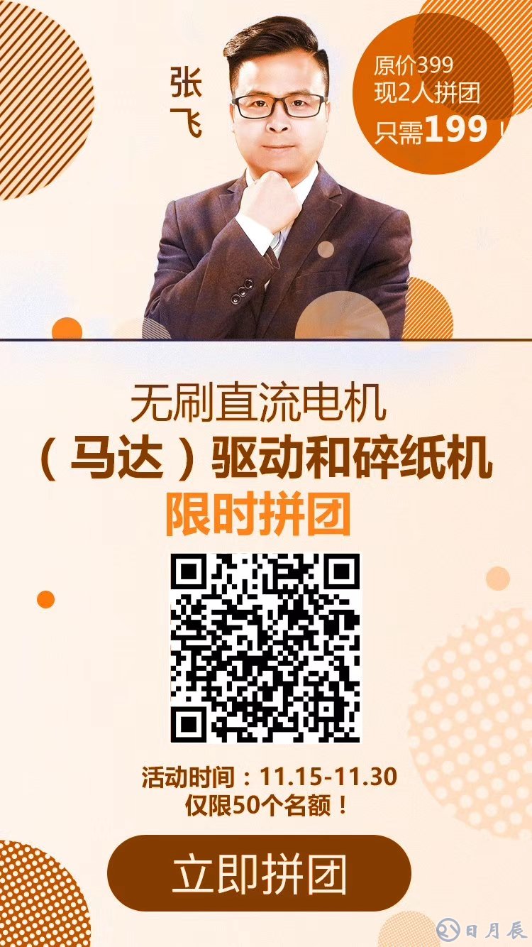 從本月15日至30日,您報名參與《張飛無刷直流馬達(驅(qū)動)和碎紙機》課程,并邀請您的任一好友參加本次課程拼團,即可享受活動特惠拼團價!