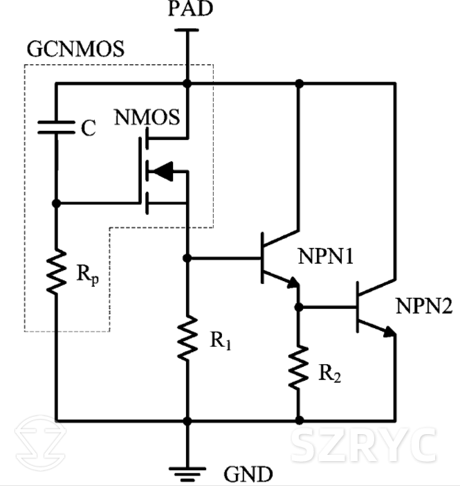 GCNMOS 是一種改進的 ESD 防護結構,其基本工作原理是,當輸入電壓超過一定的閾值時,NMOS 的柵極和漏極之間會形成一個擊穿通道,將過高的電壓引導到地線。