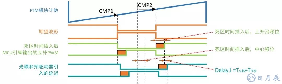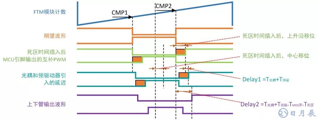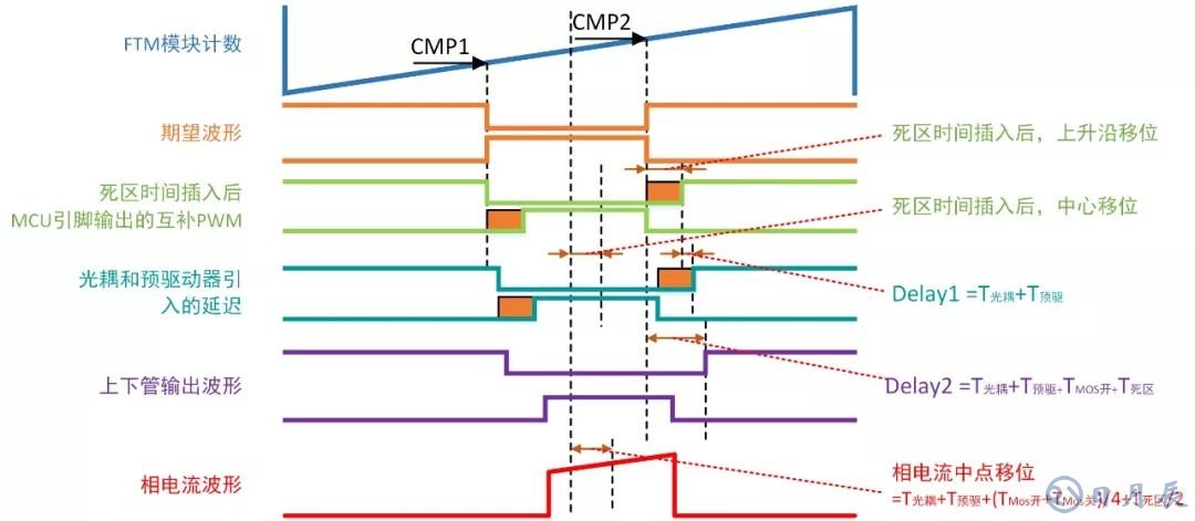 在MCU控制FTM模塊輸出PWM波形到MOSFET柵極受控制的那一刻之間,各種光電耦合器和預驅(qū)動器的信號響應導致了額外的延遲。