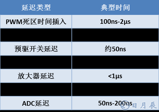 下面表格詳細指明了電機驅(qū)動系統(tǒng)拓撲中存在的七個延遲源及其典型的時間。這些延遲將疊加在一起,產(chǎn)生的影響是:實際輸出PWM波形滯后于MCU計算預期輸出的PWM波形,按照這個計算,相電流采樣點需要滯后于MCU計算預期輸出的PWM波形的中間時刻。