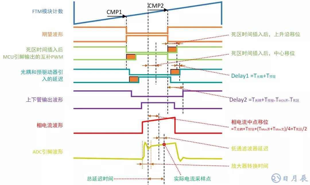 在雙電阻采樣的電機驅(qū)動FOC控制中,采樣點設置為驅(qū)動橋下管打開的中間時刻。注意,這里是驅(qū)動橋下管打開的中間時刻,而不是MCU輸出的PWM周期中間時刻。因為從MCU計算生成PWM到電流信號送入MCU的ADC模塊,這個典型的驅(qū)動拓撲中,存在多達七個延遲源!