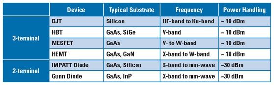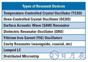微波振蕩器用于上至移動電話及GPS導航系統(tǒng),下至無線電和測試設備的各種領域。振蕩器的目的在于通過各種方式生成具有特定頻率的連續(xù)諧波輸出。振蕩器一般由有源器件(如晶體管,二極管或微波管)和用于確定頻率的無源諧振元件(見表1)組成。在射頻振蕩器(RFO)這一復雜領域中,固態(tài)振蕩器因其輕量、小巧、高性能及高可靠性等優(yōu)點逐漸占據主導地位。