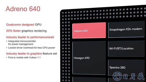 GPU圖形核心一直是高通的強(qiáng)項(xiàng),這次升級(jí)為Adreno 640,高通自主設(shè)計(jì),集成微控制器,并有最低的驅(qū)動(dòng)過(guò)載以降低CPU功耗,整體能耗比業(yè)界領(lǐng)先,同時(shí)還有豐富的圖形技術(shù)特性,包括第一個(gè)支持Vulkan 1.1圖形規(guī)范,同時(shí)繼續(xù)支持OpenGL ES 3.2、OpenCL 2.0 FP。