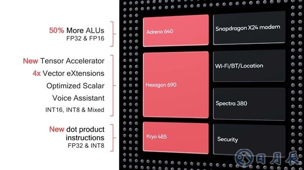 同時(shí),Adreno 640 GPU ALU算數(shù)單元數(shù)量增加了一半,支持FP32單精度、FP16半精度浮點(diǎn)運(yùn)算,Kryo 485 CPU則支持FP32浮點(diǎn)與INT8整數(shù)運(yùn)算。CPU、GPU、DSP加上張量加速器,所有單元綜合實(shí)現(xiàn)了專(zhuān)有的、可編程的AI加速。