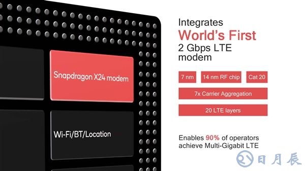 驍龍855自身集成的基帶是驍龍X24,采用7nm工藝制造,搭配14nm工藝的RF射頻芯片,是全球第一個(gè)2Gbps LTE移動(dòng)方案(麒麟980 1.4Gbps),下載最高支持LTE Cat.20網(wǎng)絡(luò)制式,并支持20個(gè)LTE層、七個(gè)20MHz載波聚合、256-QAM、4×4 MIMO,上傳則最高支持LTE Cat.13,最大速率318Mbps,支持三個(gè)20MHz載波聚合、256-QAM、上傳數(shù)據(jù)壓縮。