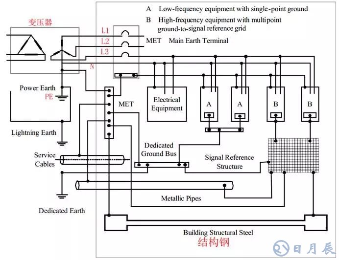 而我們一般都知道用電設(shè)備要接地,這就是三相五線制中的PE線,也叫保護(hù)地線,用來連接設(shè)備的金屬外殼防止漏電。那么,下圖就是電廠的電經(jīng)過變壓傳輸后到達(dá)用戶端后的一個(gè)復(fù)雜配電網(wǎng)絡(luò)的配置,屬于低壓配電系統(tǒng)中的常用的TN-S系統(tǒng)。