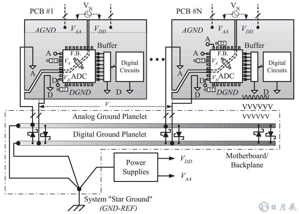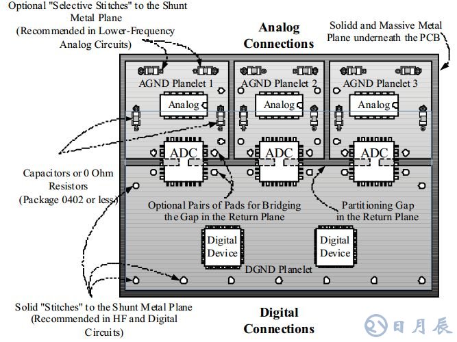 對于源(功率源、信號源、干擾源)的回路設(shè)計(jì)是最基本的出發(fā)點(diǎn),但是在實(shí)際中又不能默守陳規(guī)嚴(yán)格按照原則劃分,否則出現(xiàn)問題的可能性還是很大,比如什么時(shí)候模數(shù)的地需要分開,如何評估互相之間的影響等,分割地之間的聯(lián)系方式等。因此我們需要掌握這些基本原則,對設(shè)計(jì)有宏觀原則的理解,然后結(jié)合實(shí)際去設(shè)計(jì)真正符合應(yīng)用要求的電路,最后這張圖就是一張非常清晰的關(guān)于地設(shè)計(jì)的結(jié)構(gòu)參考示例。
