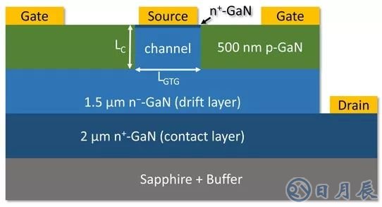 研究人員使用低成本的2英寸藍寶石襯底通過MOCVD生成準垂直vc-JFET。之后使用重n型摻雜GaN層實現(xiàn)背面“虛擬”接觸(圖1)。真正的垂直器件會使漏極觸點穿過晶圓的背面 - 這是使用絕緣藍寶石無法實現(xiàn)的。