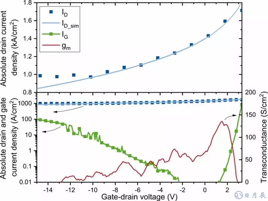 圖2:1V源極 - 漏極偏置下的準垂直vc-JFET的漏極和柵極電流以及跨導,傳輸特性。 標準化為通道橫截面。
