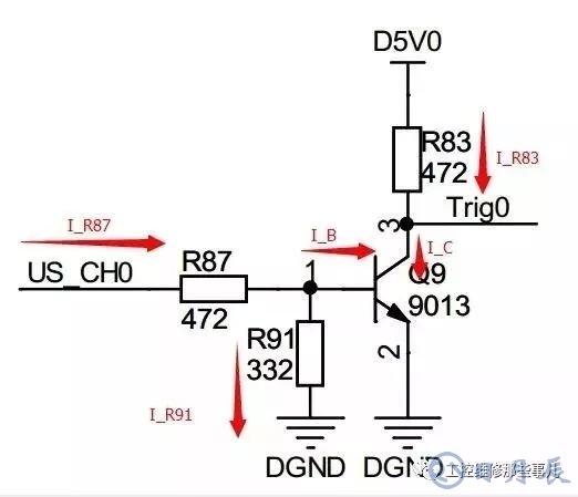 假設(shè)沒(méi)有R91,當(dāng)US_CH0電平狀態(tài)不確定時(shí),默認(rèn)是要Trig輸出高電平還是低電平呢?因此R91起到固定電平的作用。同時(shí),如果無(wú)R91,則只要輸入>0.7V就導(dǎo)通三極管,門(mén)檻電壓太低了,R91有提升門(mén)檻電壓的作用(可參見(jiàn)第二小節(jié)關(guān)于蜂鳴器的分析)。