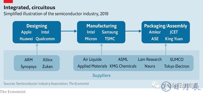 這些極其復(fù)雜的芯片催生了同樣復(fù)雜的供應(yīng)鏈,涉及全球成千上萬半導(dǎo)體產(chǎn)業(yè)鏈企業(yè)。美國貿(mào)易組織半導(dǎo)體行業(yè)協(xié)會(huì)(SIA)估計(jì)其成員中有一家擁有超過16000家供應(yīng)商,其中超過8500家在美國境外。作為芯片組件的原材料和零件交叉并重新遍布世界,最終成為智能手機(jī)的大腦、汽車的防抱死制動(dòng)系統(tǒng)或數(shù)以千計(jì)的其他產(chǎn)品。