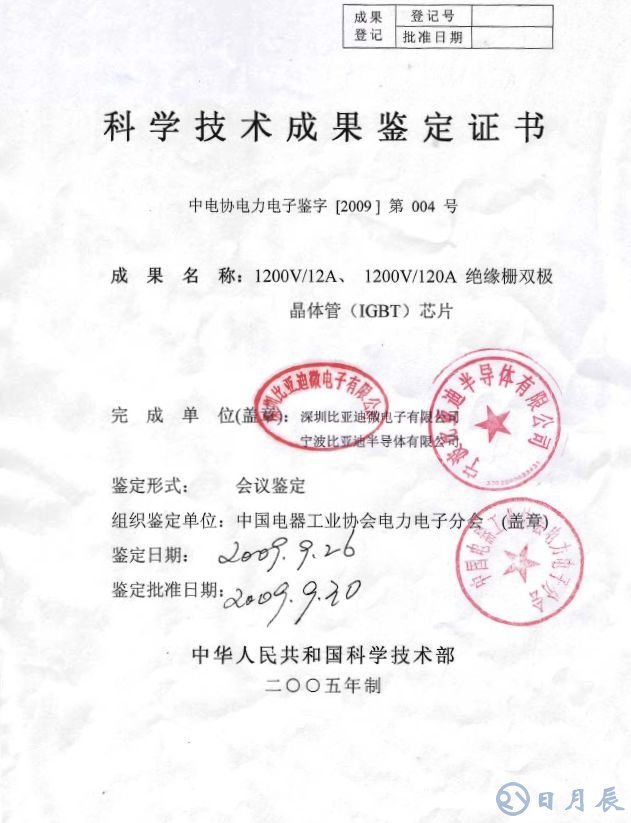 2009年9月,比亞迪IGBT芯片通過了中國電器工業(yè)協(xié)會電力電子分會組織的科技成果鑒定,打破了國際巨頭的技術壟斷。