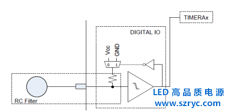 MSP430根據(jù)型號的不同支持多種電容觸摸檢測方式,有RC 震蕩、比較器、PIN RO,本設(shè)計使用的是PIN Relaxation Oscillator 方式,原理如圖,芯片管腳內(nèi)部檢測電路由施密特觸發(fā)器、反向器,以及一個電阻組成,震蕩信號經(jīng)過施密特觸發(fā)器變成脈沖信號,再通過反向器反饋回RC 電路,通過Timer_A對施密特觸發(fā)器的輸出進(jìn)行記數(shù),再通過設(shè)置測量窗口Gate 獲得記數(shù)的結(jié)果。當(dāng)手指觸摸電極,電極上的C 產(chǎn)生變化,導(dǎo)致震蕩頻率改變,這樣在定長的測量窗口就能獲得不同的記數(shù)結(jié)果,一旦差值超過門限,結(jié)合一定的濾波算法判斷就可以觸發(fā)觸摸事件。
