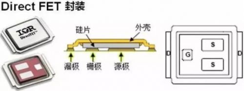 Direct FET封裝屬于反裝型,漏極(D)的散熱板朝上,并覆蓋金屬外殼,通過金屬外殼散熱。Direct FET封裝極大地改善了散熱,并且占用空間更小,散熱良好。