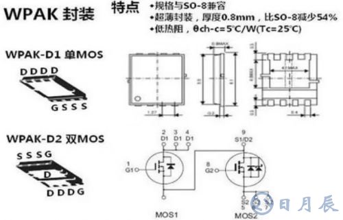 WPAK是瑞薩開發(fā)的一種高熱輻射封裝,通過仿D-PAK封裝那樣把芯片散熱板焊接在主板上,通過主板散熱,使小形封裝的WPAK也可以達(dá)到D-PAK的輸出電流。WPAK-D2封裝了高/低2顆MOSFET,減小布線電感。