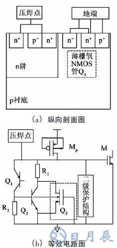 圖2(a)是可控硅整流器(silicon controlledrectifiers,SCR)ESD保護結(jié)構(gòu)的縱向剖面圖,圖2(b)是這種結(jié)構(gòu)的等效電路圖。