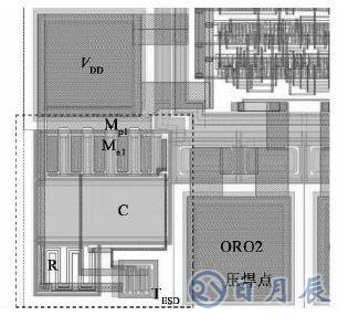 圖5中虛線框部分是這種改進的全芯片ESD保護結(jié)構(gòu)的版圖,該圖顯示了邏輯控制管Mp,Mn和RC網(wǎng)絡(luò)以及最重要的薄柵管TESD的位置,其中電容與其下的阱電阻組成ESD探測器。從圖5可以看出,一個全芯片的ESD保護結(jié)構(gòu)所占的芯片面積只比一個壓焊點的面積略大,也就是說在某一個芯片中插入這種全芯片的ESD保護結(jié)構(gòu)后,不會引起該芯片的面積增加太多,但可以大大提高該芯片的ESD保護能力。