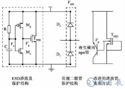 這種全芯片的ESD保護結(jié)構(gòu)能夠很好地提高電路的ESD保護能力,但當半導(dǎo)體工藝到深亞微米階段,為了防止熱載流子效應(yīng),都會在MOS的源漏端采用淺摻雜( lightly doped drain,LDD)結(jié)構(gòu)。圖4中的TESD管就采用了LDD結(jié)構(gòu)。當TESD管導(dǎo)通泄放ESD電流時,大電流從這個管子的表面通過,這樣結(jié)深很淺的淺摻雜處很容易損壞,從而限制了這種全芯片ESD保護結(jié)構(gòu)的防護能力。