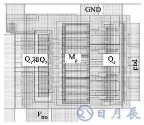 圖3顯示了改進的SCR ESD保護結(jié)構(gòu)的版圖,包括作為ESD保護器件的Q1,Q2和寬長比為180/1的PMOS管Mp,還有就是作為ESD二級保護器件的薄柵管Q3.圖中VDD是管子所接的電源端,GND是管子所接的地端。