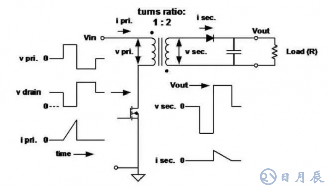 ■在開關接通階段存儲在初級電感中的能量,在開關斷開階段通過另外的繞組和二極管釋放。