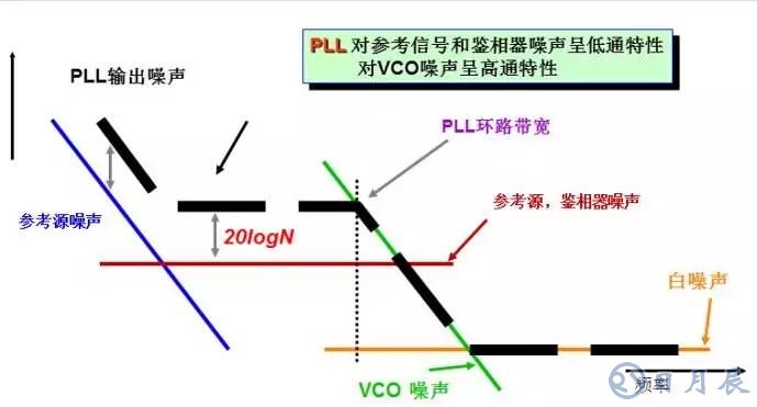 對參考源,PLL 為低通特性,帶寬為環(huán)路帶寬。PLL輸出相噪是參考信號相噪按N倍頻惡化。N越大,PLL輸出相噪指標越差。在環(huán)路帶寬外,PLL輸出相噪由VCO 決定。