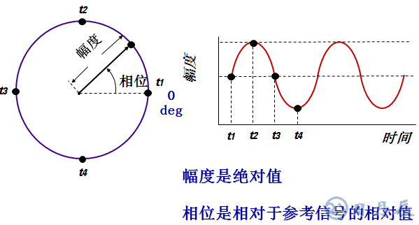 用矢量來描述一個正弦波是非常方便的。在極坐標中,矢量表示正弦波的峰值電壓幅度對于相位改變量的關(guān)系。相位旋轉(zhuǎn)360度表示一個完整的頻率周期。請注意,相向符號提供了一種表示正弦波相位隨時間變化的便捷方法。圖中示波器表示了一種信號幅度隨時間變化的過程。向量不能直接提供任何頻率信息。事實上,我們測量向量相對于載波信號的參考相位。這樣作意味著,矢量僅在頻率不同時會發(fā)生旋轉(zhuǎn)。