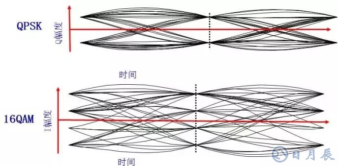眼圖以無限持續(xù)的方式反復(fù)顯示I和Q幅度對時間。I和Q轉(zhuǎn)換可單獨顯示,在確定符號的時刻形成“眼睛”。QPSK有4個不同I/Q狀態(tài),各在一個象限。I/Q各有兩個電平,對每個I和Q形成一個眼睛。下面一張圖是16QAM的例子,4電平圍成3只眼。重要的是理解眼圖的概念。好的信號具有“張大”的眼睛,交點對應(yīng)星座圖上符號點位置,調(diào)制質(zhì)量越高,交點越集中。