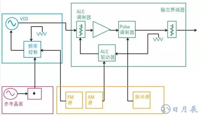 信號源利用ALC(自動電平控制)技術(shù)來保證輸出信號的幅度。大范圍幅度調(diào)整由衰減器完成。