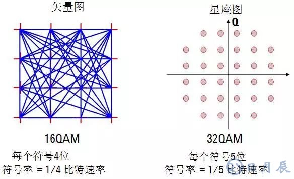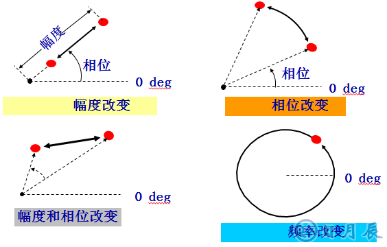 下圖各種調(diào)制信號在I/Q平面表示的例子。理解了它們,你對所有I/Q調(diào)制原理也就理解了。在任何I/Q圖中,如圖信號沿徑向改變幅度,意味著信號相位在變化(且僅僅是相位發(fā)生變化)。所以AM調(diào)制,I/Q圖中僅是矢量徑向變化。PM調(diào)制是矢量旋轉(zhuǎn)。FM看起來象PM,因為偏離載波頻率就是單位時間內(nèi)相位的變化。記住,幅度和相位變化都是相對于未調(diào)制載波的。失量圖(Vector diagram) 是描述矢量信號變化軌跡的一種直觀方式。