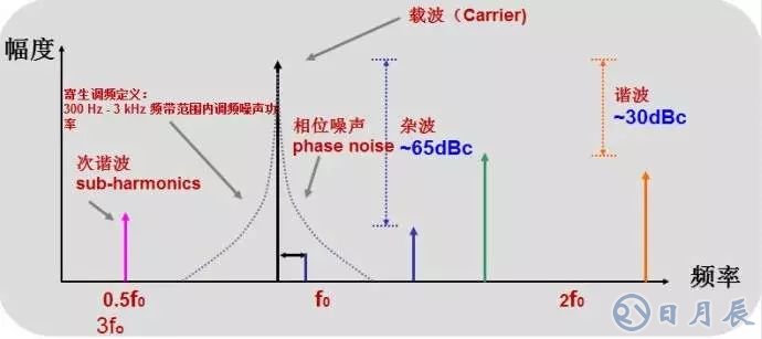 正弦波或連續(xù)波信號質(zhì)量好壞的評估主要在頻域上進行,頻域上的雜散包含連續(xù)和離散成份,它們都對應(yīng)時域上的失真。連續(xù)的噪聲邊帶稱為相位噪聲,離散的雜散根據(jù)其與基波的頻率關(guān)系分為諧波和雜波。