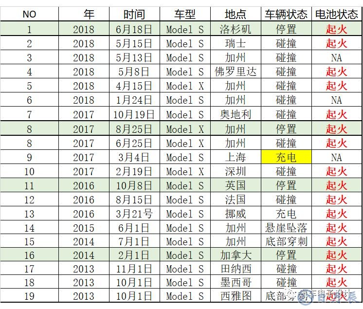 從后兩年開始,我們將直接面對特斯拉在家門口的競爭,可行的策略,是電池成本要和它相當(dāng)、車輛里程要與之相當(dāng)、能量密度和安全性要與之相當(dāng),反正不能比它差。在所有的特斯拉已知的事故里面,電池起火是大概率的事情,如下表所示,這里面有幾個地方,值得往下進(jìn)一步去挖掘。