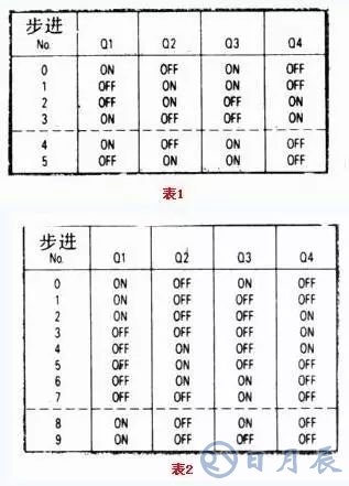 四相混和型步進電機,有一特點很有用處。它可以用半步方式驅動。就是說,在某一時間,步進角僅前進一半。用單個混合或用雙向開關即可實現,這種邏輯時序由表2列出。