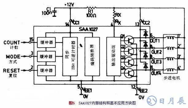 實際上,集成電路有三路緩沖輸入,每一個緩沖輸入都控制一個二位(四狀態(tài))的同步可逆計數器。它的輸出送到一個編碼變換器。然后用四路輸出,去控制輸出級的四個晶體管。輸出級以集電極開路方式工作。電機的繞組線圈串入集電極。為防止反向電動勢損壞晶體管,在繞組的兩端并聯一反向二極管。