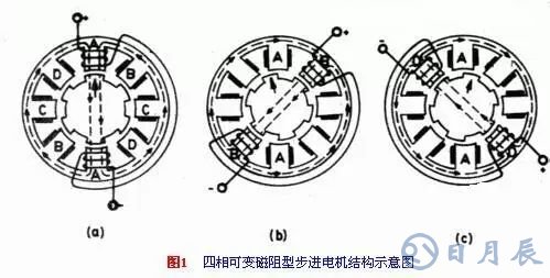 圖1是一種四相可變磁阻型的步進電機結構示意圖。這種電機定子上有八個凸齒,每一個齒上有一個線圈。線圈繞組的連接方式,是對稱齒上的兩個線圈進行反相連接,如圖中所示。八個齒構成四對,所以稱為四相步進電機。