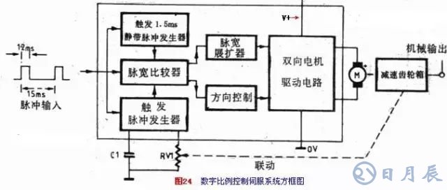 伺服電機的最好類型之一,是用數字比例遙控系統(tǒng)。實際上這些裝置是由三部份組成:采用集成電路、伺服電機、減速齒輪盒電位器機構。圖24是這種系統(tǒng)的方塊圖。電路的驅動輸入,是用周期為15ms而脈沖寬度為1~2ms的脈沖信號驅動。輸入脈沖的寬度,控制伺服機械輸出的位置。例如:1ms脈寬,位置在最左邊;1.5ms在中是位置,2ms在最右邊的位置。