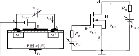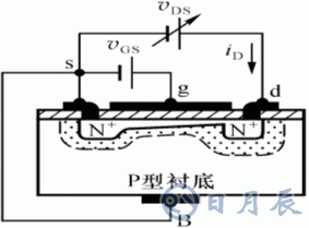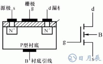 s:Source 源極,d:Drain 漏極,g:Gate 柵極,B:Base 襯底,在P型襯底擴散上2個N 區(qū),P型表面加SiO2絕緣層,在N 區(qū)加鋁線引出電極。