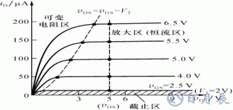 與三極管的特性相似,也可分為3個區(qū):可變電阻區(qū),放大區(qū)(恒流區(qū)、飽和區(qū)), 截止區(qū)(夾斷區(qū))。可變電阻區(qū)管子導通,但溝道尚未預夾斷,即滿足的條件為: