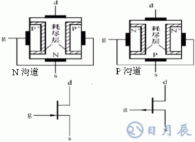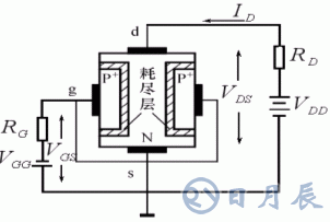在N區(qū)兩側(cè)擴散兩個P+區(qū),形成兩個PN結(jié)。兩個P+區(qū)相連,引出柵極g。N體的上下兩端分別引出漏極d和源極s。