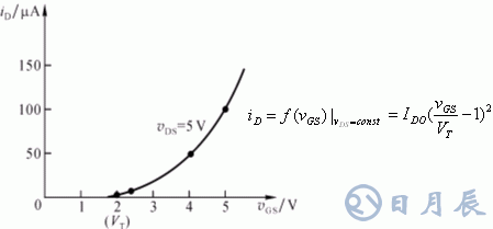 (1) 增強型NMOS管的轉(zhuǎn)移特性:在一定VDS下,柵-源電壓VGS與漏極電流iD之間的關系: