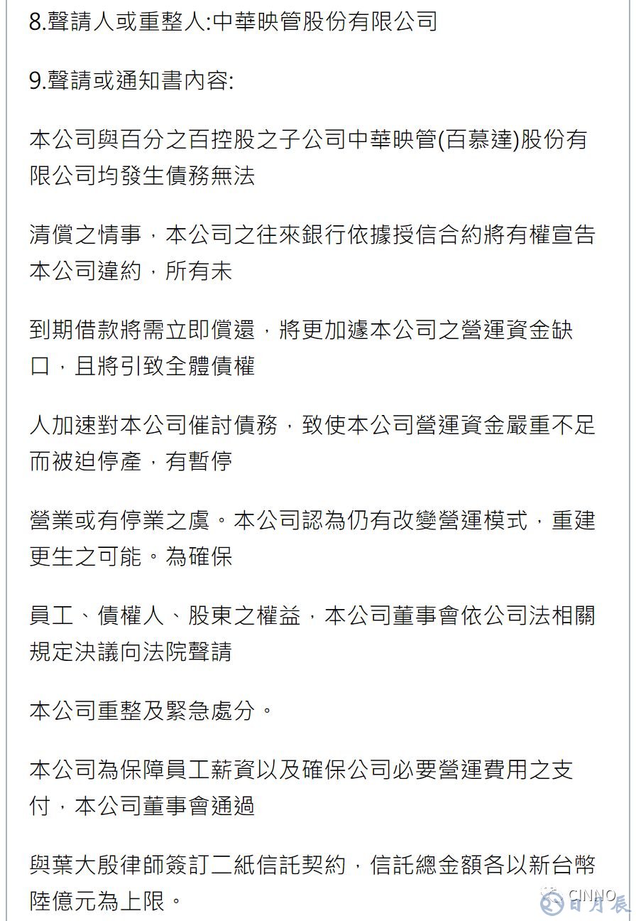 華映強調(diào),該公司認(rèn)為仍有改變營運模式,重建更生之可能;為確保員工、債權(quán)人、股東之權(quán)益,本公司董事會依《公司法》相關(guān)規(guī)定決議向法院聲請本公司重整及緊急處分。